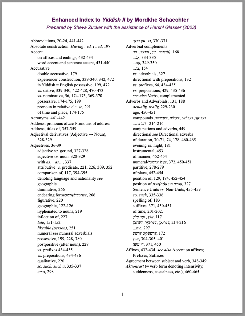 Zukhtsetl tsu Yidish tsvey, farbesert un fargresert/Enhanced Index to Yiddish II, prepared by Dr. Sheva Zucker with the assistance of Dr. Paul (Hershl) Glasser, (New York: League for Yiddish, 2023), 16 pages, free download of PDF: 250KB.