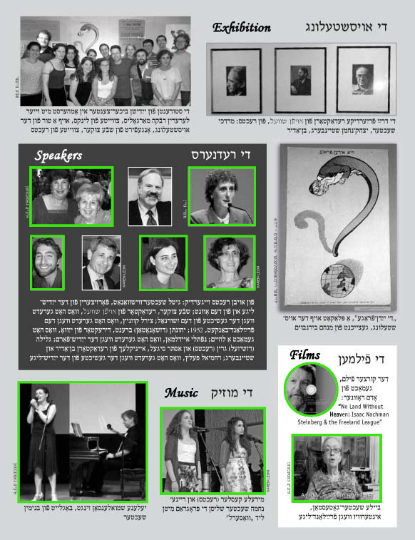 Above is page 55 from Afn Shvel #354-355 which depicts the evening's program. Click on one of the images with a green outline and a link will lead you, for example, to a page dedicated to that participant or presentation where you can read his or her lecture, read the lyrics of the songs sung or see the film.